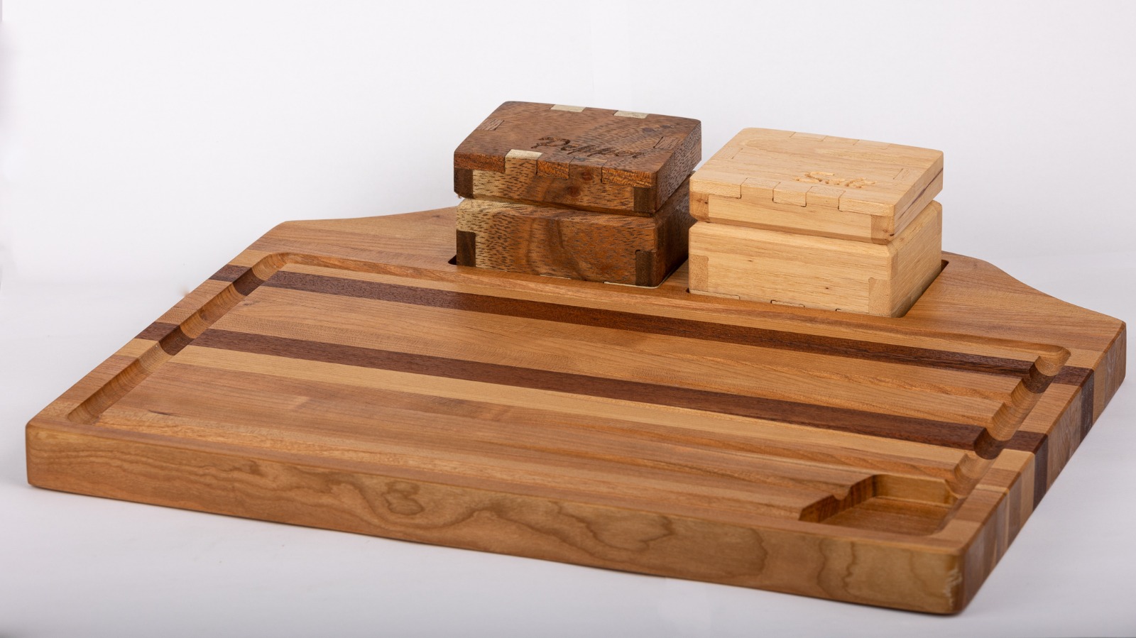 Meat board with salt and pepper holders.